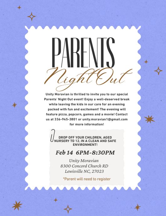 Parents Night Out waiver and registration form Unity Moravian is thrilled to invite you to our special Parents’ Night Out event on Feb 14 6PM-8:30PM! Enjoy a well-deserved break while leaving the kids in our care for an […]